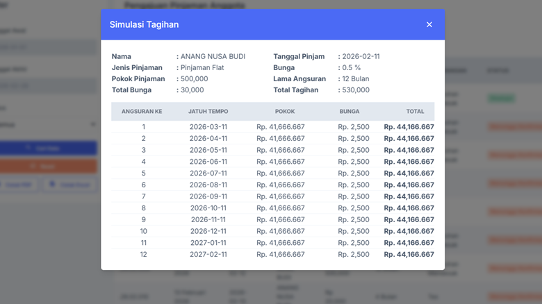7. Sebelum pengajuan Disetujui atau Ditolak Klik tombol [Simulasi Tagihan] untuk melihat pembayaran tiap bulan.