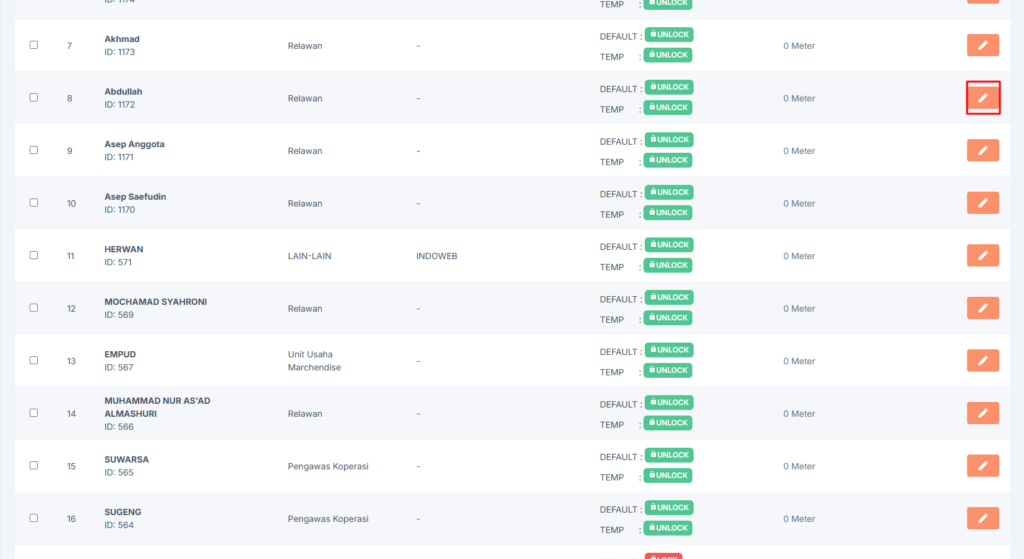 2. Kemudian akan muncul halaman Data Area Presensi, pilih nama pegawai yang ingin setting, lalu klik icon [Edit] (orange)