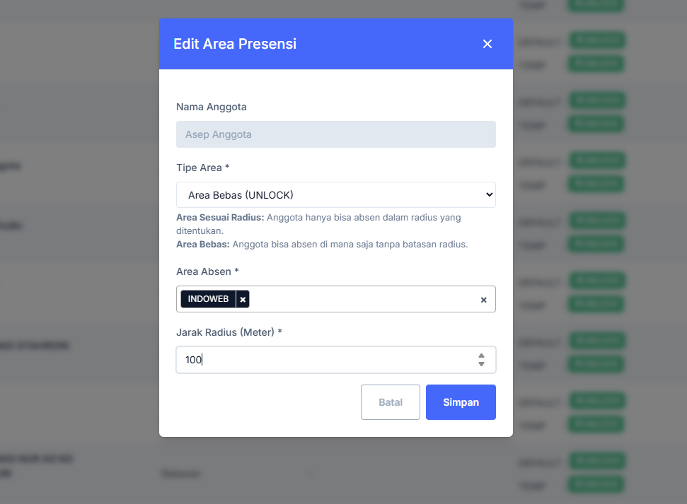 6. Jika Setting Area Presensi Pegawai sudah sesuai, klik [Simpan]